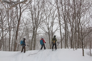 スキー場トップには今日は先客あり。男女2人組。どうやらまきchin隊は見覚えのあるお方のようです。立山で目撃との情報。出発はウチらが先になりましたが、途中で先頭を変わってからは、かなり引き離されてしまいました、で、今日のウチらですが、キャプテンまぁ君、まきchin隊、ボクの4名です。たくさんは降ってないけど、昨日のトレースは当然なくなり、角も少し取れて丸くなったような。