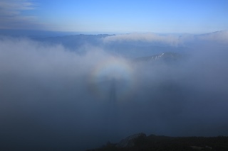 天気予報は晴れだから、そのうち晴れるだろうと思っていたら、みるみるガスが薄くなってきました。となるとお約束のブロッケン。久しぶりに見ました。昔はしょっちゅう見てたんですけどね。最近はブロッケンの出やすい朝夕はテントに引きこもることが多いからかも。空は完全に秋の空ですね。山がクッキリと見えています。