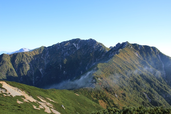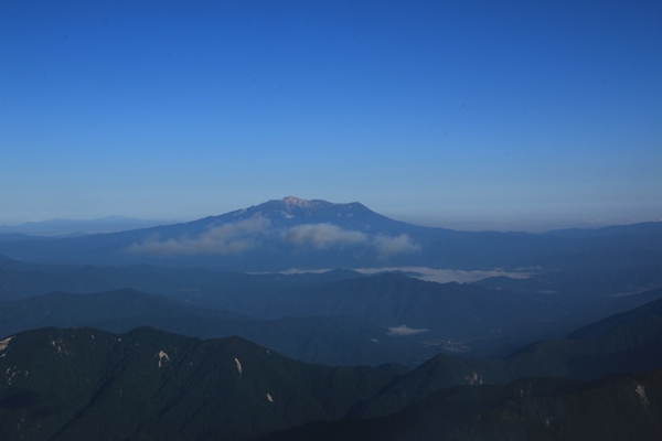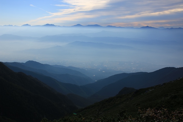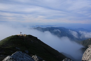 夜はテントでよく寝れました。きのうは安平路の避難小屋でイマイチの睡眠。やっぱりテントが落ち着きます。暖かいし。小屋+テントが最強ですけど。夜明け前に目が覚めて外を見ると、下界の灯りは見えるものの、空に星がない…。どうも雲があるみたい。今日はヤブのない快適登山道縦走の日なのに、晴れてもらわねば…。朝からちょっとテンション低めでした。 ◇9月22日(月) 越百小屋跡−越百山−南駒ケ岳−空木岳−檜尾岳 晴れさて出発。まずは稜線に向けて200m近く登ります。稜線にかかる雲の底がちょうどテン場あたりのようです。ただ、それほど濃い雲ではなく、時おり仙涯嶺のピーク近くが見えかけたりしてます。斜面の広葉樹は色付き始め。きのう下る時、朝日に照らされた紅葉を楽しみにしてましたが、これじゃあダメでだなあ…。越百山に着きましたがガス。でも薄そう。