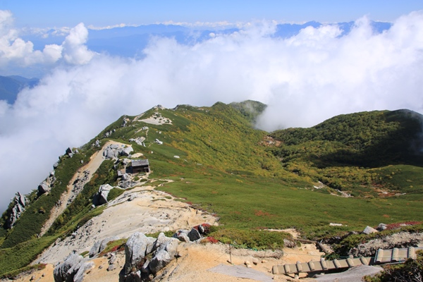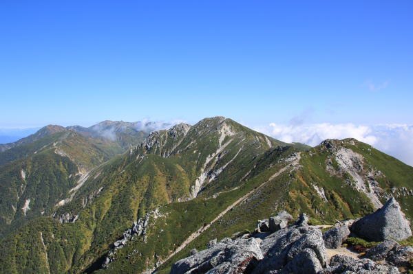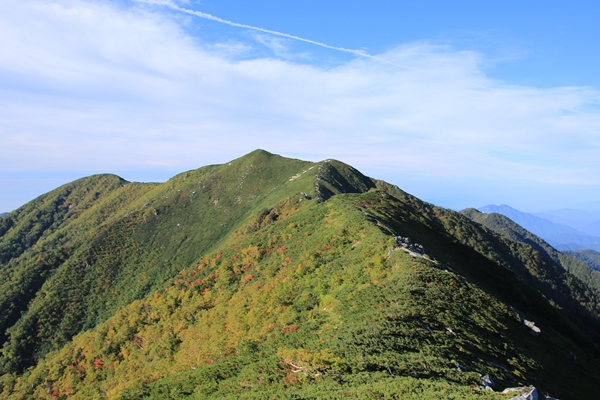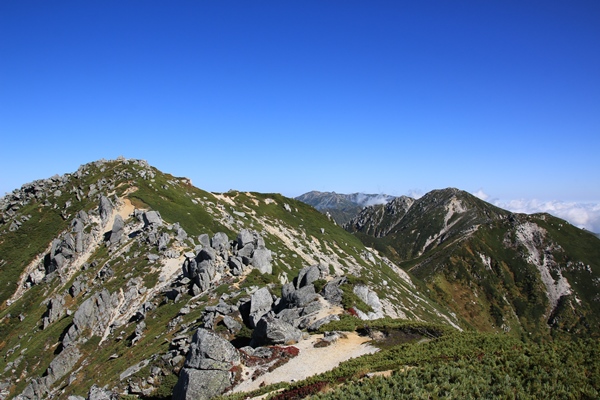 空木岳には4人ほど。百名山なのに少ないなあ…。やっぱり平日か。真上の空は晴れているんですが、伊那谷側に雲が出ています。これから歩く稜線にも少し雲がかかっています。午後にかけて増えてくるんだろうか…?空木平の紅葉もまだですね。池山尾根はむか〜し一度下ったことがあるけど、ほとんど記憶にありません。紅葉の時分に一度登ってみたいです。