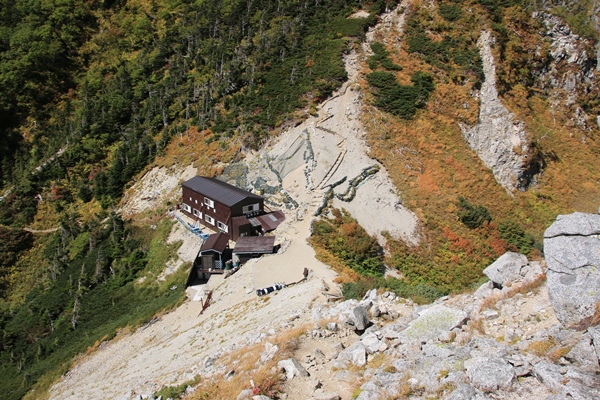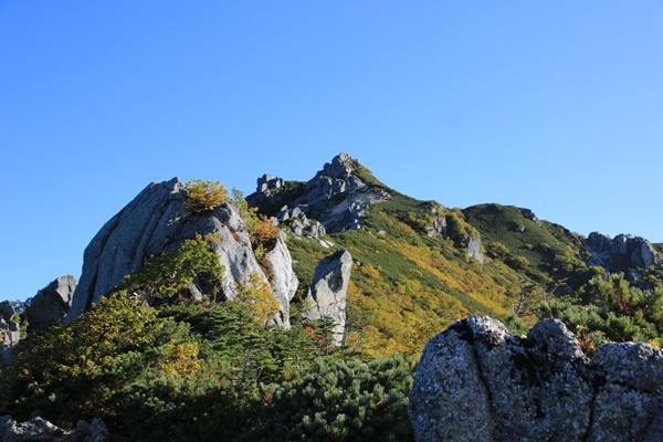 次のピークであります赤梛岳へは大きな登り下りはありません。右下には擂鉢窪のカールが広がっています。紅葉が進んでれば降りて紅葉狩りでも…と考えていましたけど、それほど染まっていないのでパス。足も棒ですし…。昨日の行程、安平路の避難小屋からあわよくば擂鉢窪まで…とかも考えましたが、全然無理ですな。