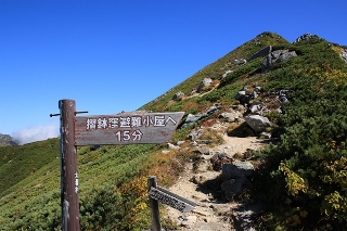 空木岳から勿体ないほど下って木曽殿越。木曽殿山荘があります。ここで今晩のビール補給。ついでに今飲むビールも買いました。檜尾岳の水場について尋ねると、細いしキレイではない…とのこと。だったらここで汲んで背負った方がいいでしょう。水場まで片道9分だそうな。大きな登り返しを前に3L+350mlがザックに追加です。小屋のベンチでしばらく休憩。