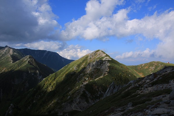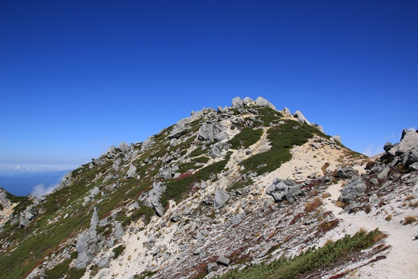 戻って南駒ヶ岳山頂を踏むつもりでいましたが、足が棒なので気力が失せてここで休憩。南駒の山頂は学生風の団体さんで賑わっていました。ここまでは大きな南駒ヶ岳に遮られて北の山並みが見えませんでした。ここからは今から歩く山並みが北へと伸びているのが見えます。木曽駒とか宝剣岳も見えていますが、まだまだずっと先ですね。