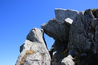 先客のおじさんと同時出発になりました。『先に行って下さいね〜』とか言うわりに道を譲るわけでもなく…。南駒ニセピークへの登り、おじさんが道を間違えたスキに前に出ることができました。ニセピークに騙されるんですが、本峰へはもう大きな登りはありません。楽勝!とか思ってたら、メインの登山道からはずれて本峰を巻く道へ。すぐに気が付いたけど、まあいいかとそのまま進むと山頂先の小コルに出ました。