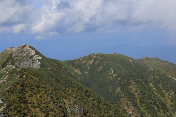 熊沢岳を越え次の檜尾岳が本日のゴール。檜尾岳の東のピークに建つ赤い避難小屋がよく目立ちます。最後というのはキツイもんで、しかも登り下りが激しい…。2708mが偽ピークというのは気付いていたものの、そこからのアップダウンの大きさに目が点。それほどでもないけど最後なんでね…。檜尾岳山頂には人影が。避難小屋は貸切ではないみたいですね。