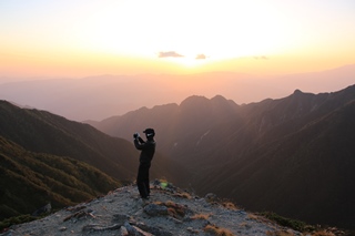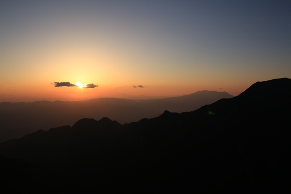 疲れたー!檜尾岳には3名。2人組と単独。2人組は山頂でテント泊。単独は避難小屋のようです。避難小屋泊の予定だったけどもう動きたくないので山頂で泊まります。小屋から溢れて張る人が多いのか、かなりの張り数可能な感じでした。山頂にいた3人の中に加わり、久しぶりに日没を見て寝ます。