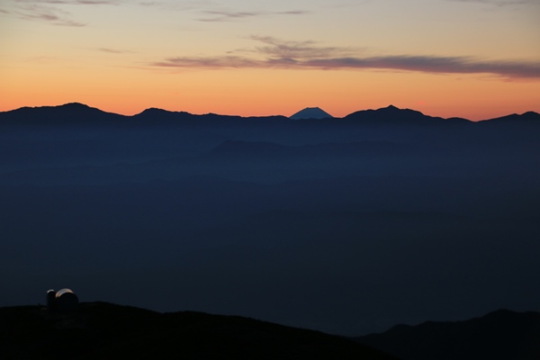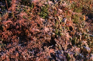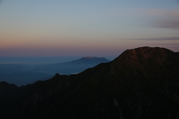雨マークと雲マークが並んでいたこの飛び石4連休。蓋を開けてみれば初日が曇りだった以外は晴れ続き。台風が遅かったのと、北の高気圧が強かったのが要因だそうな。その北の高気圧に覆われて今朝も冷え込みました。テントにはビッシリと霜が貼り着いています。高山植物の葉っぱも霜の花がキレイに咲きました!空が薄明るくなったところでテントの外を見てみます。極薄の月が東の空にありました。 ◇9月23日(火) 檜尾岳−宝剣岳−木曽駒ヶ岳−将棋頭山−千畳敷 晴れ朝飯を食って、そろそろ日の出ショーの始まりってとこで山頂へ。そろそろ…と思ってからが長いんです。しばらく待ちです。赤く染まった空に南アルプスと八ヶ岳がクッキリと影になっています。甲斐駒山頂のすぐ右から朝日が出てきました。5人でこの日の出ショーを観賞。一人だったら多分テントに籠っていただろうな。付着した霜でテントが大きく重くなってしもーた。