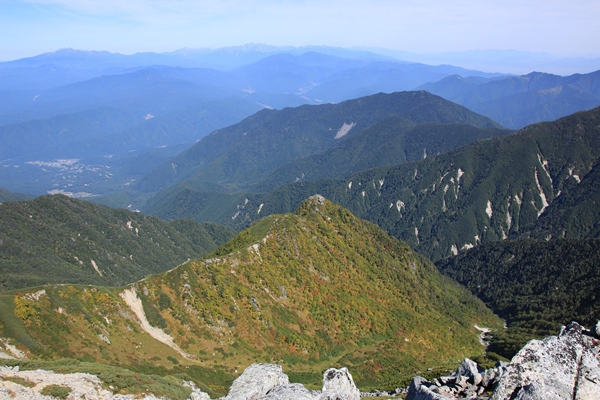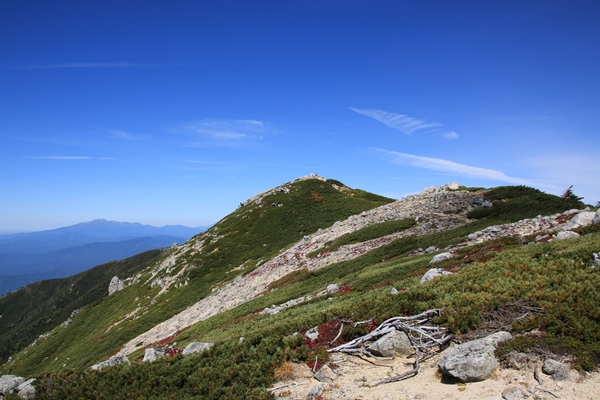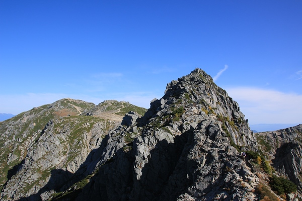 昨日の朝は脚が棒でしたが、今朝は疲れが残らず快調。そうはいっても檜尾岳から極楽平まではアップダウンが大きくて堪えます。三ノ沢岳が良く目立っています。宝剣との間に詰め上げる伊奈川本流がいい感じです。なかなか機会に恵まれませんが、そのうち行っておかねばってとこです。島田娘に着くともう極楽平と宝剣岳はすぐそこ。