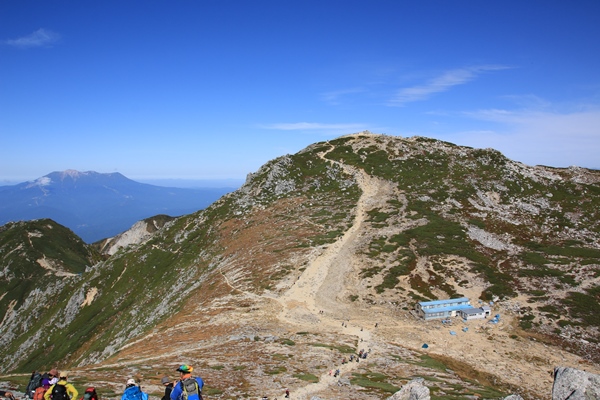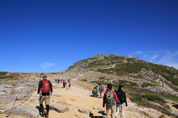賑わう中を木曽駒ヶ岳へ。それでもまだ朝一番なので少ないのかな。将棋頭山がよく見えるところで腰をおろします。南端の摺古木山から北端(ではないが)の将棋頭山まで計画したものの、なんか疲れたなあ〜。もう下山したいなあ〜。今降りればロープウェイやバスも空いてるだろうなあ〜。地図を見てコースタイムを足してみると、まだ5時間もあるではないか…。