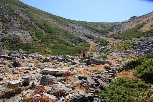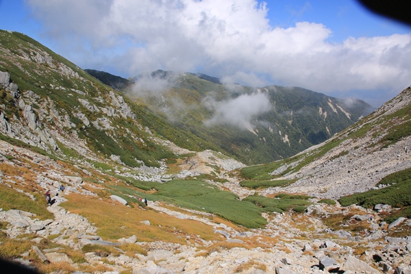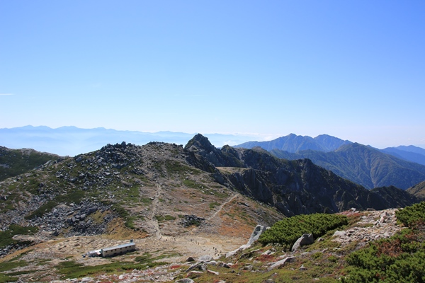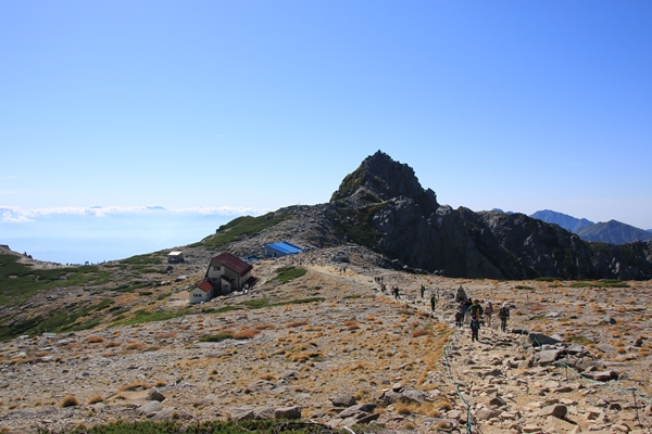 宝剣岳の北側は登山者多いです。観光地ですね。宝剣山荘は素通り。これが失敗。中岳を降りてキャンプ場を管理している小屋に行くと閉まっていました。最北の将棋頭山で飲むビールを調達するはずでした。宝剣山荘で買っておけばよかった…というお話でした。ってことは、キャンプ場は無料?その代わり、水持ってなければ大変だ。