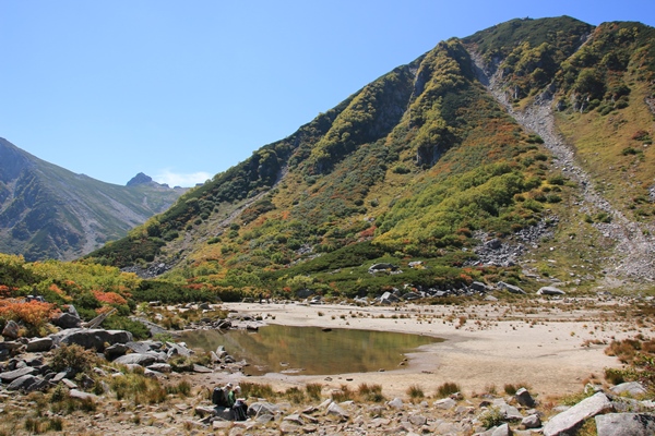 中央アルプス縦走 摺古木山から将棋頭山へ4日目 檜尾岳から将棋頭山![]() 濃ヶ池の色づきはじめた紅葉