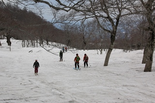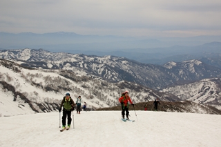 夕べは日が変わるまで信テレ宴会を楽しみ、苦しい朝を迎えました。きのうは快晴の鳥海山を満喫。今日はくもりで後に雨が降る予報です。テンションは高くないですが、降らないのなら行くってもんでしょう。Yさん夫婦にaskともに初月山なので、フツーに姥沢から月山登頂!天気持ちそうなら裏側の良い斜面を1本…の予定で動き出します。 すると昨日まで八甲田にいた宴会チームですが、昨日のうちに大移動して今日は姥沢から山に入るとの情報が…。月山スキー場は8時に営業開始。それに合わせて向かいます。7時半に姥沢着。お出迎えです〜。5人かと思ったら人数多いですね。まっちゃん&みいさん、まぁ君、ゴロ太君&まきchin、そしてお初にお目にかかるユッキー&ヨッシーのお二人。