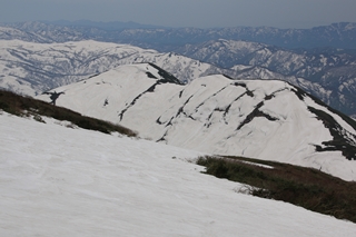 姥ヶ岳から北西面を滑るんですが、直下は雪がつながっていません。風上面は雪付き悪いです。ヤブを進んで雪のあるところへ。ここでキャプテンまぁ君が偵察へ。雪がつながってるところを探しに行ってくれました。結局のところ、板をはずしたのは山頂から少しだけ。あとは滑れました。雪はまずまずのザラメ。装束場までは斜面も良くて楽しめました。