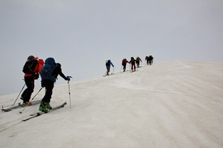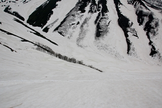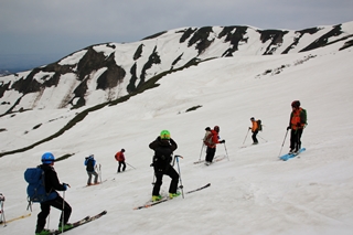 滑っても急斜面なところに取り付きます。あちこちにある割れ目を避けながら稜線目指します。雪は程よく緩んでて、シールの効きはいい感じ。11人がそれぞれに登っていきます。シートラ2名、スキーアイゼン装着する人、そのまんま登る人…。力量の差が出るとこかな。最初に登った人から最後に登った人の時間差がかなりありましたね〜。
