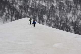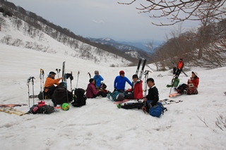 稜線でひと休み。曇りベースの天気は相変わらず。時々明るくなったりと思わせぶりな空。山頂まであと標高差200mとのこと。山頂に向かって登り始めますが、途中で『もうやめよう』…の声。程々に急な斜面を滑ることに。若干荒れ気味の斜面でしたが、あっという間に石跳川の川床に。シール不調で下で待ってたまきchinと合流して宴会タイム。