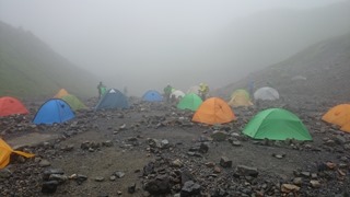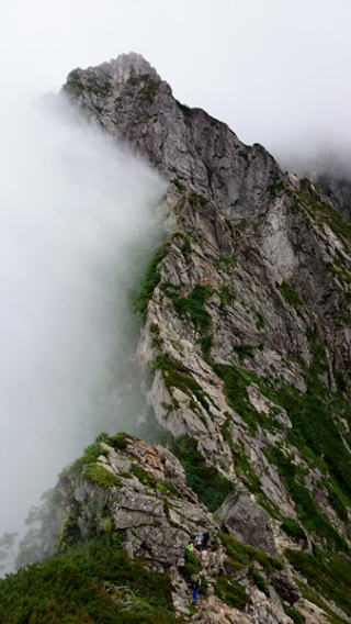 ◇8月4日(月) 白馬テン場−不帰キレット−五竜山荘 雨のちくもり4時に起きてテントから顔を出すとまさかのガスガス…。朝は晴れてるもんと思っていたから、ありゃりゃ…ですわ〜。天気予報を確認したいけど、窪地にあるテン場はあいにく圏外。昨日の予報では晴れベースで午後は不安定とか言ってたはず。そのうち晴れてくれると信じて準備しますが、テンションは低いです…。なので、普段よりさらにダラダラと準備。