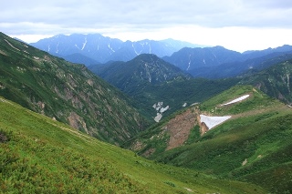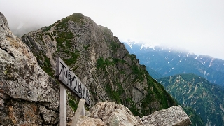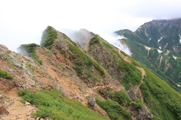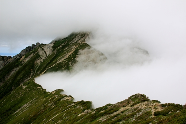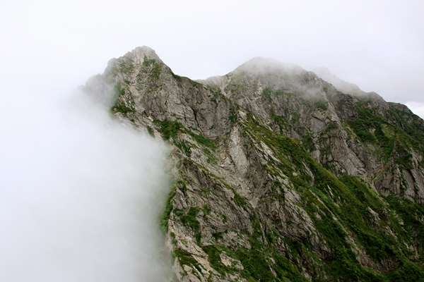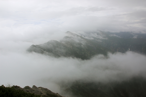 本降りだった雨が霧雨に変わり、天狗の大下りに差し掛かったところで雨はやみました。雲も多少薄くなり、キレットと不帰の峰々がボンヤリと見渡せます。西の方向を見ると、立山・剱の山並みが…。富山の街と能登半島もクッキリと見えています。悪いのはやっぱり山だけだな。信州側からは雲が湧き上がってきています。