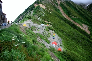 二峰南峰まで登ると難所は終わり。三峰はテクテク歩ける普通の山。ガスの向こうにボンヤリとハイカーで賑わう唐松岳が見えています。唐松岳は八方からお手軽に登れる山なので、家族連れとか多いです。客層がガラリと変わるのが面白いですね〜。山頂でしばし休憩。今日は唐松泊りも考えましたが、このテン場を見ると泊まる気しないなあ…。テン場と小屋の標高差がすご過ぎる!トイレとかでいちいち小屋まで登る気がしないぞ…ということで、もうひと頑張りして五竜まで進むことに決めました。