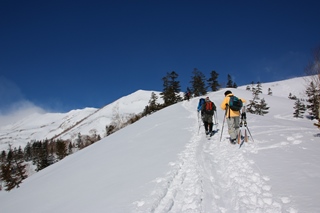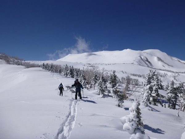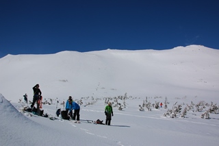 このあたり新雪が数センチ。その下はカチカチの雪。木曜日のまとまった雨、山も雨(もしくは湿り雪)だったんでしょう。で、きのうの金曜日に少し降った…と。少し降ったおかげで景色はリセットされました。天狗原までは途切れ途切れではありますが、行列ができたりして大盛況!1月に登った時はキツそうだったブナさん、今日は全く問題なしです。トシ君もだいぶ慣れてきたかな…って感じで。