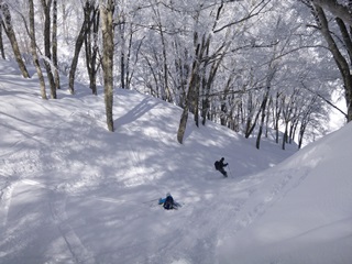 ちょうど雪庇と雪庇の間からドロップイン!まさにここからお滑り下さいという感じ。若栗の頭までの標高差約300mは大きな斜面はないけど、段々状でところどころ楽しめる斜面が。木の生え具合もいいですね〜。上の方はダケカンバ中心で、途中からブナになります。ブナになると樹氷がビッシリ着いていて、それはそれは空の青に映えてキレイでした。景色も良いし、いるだけで気持ちよかったです。