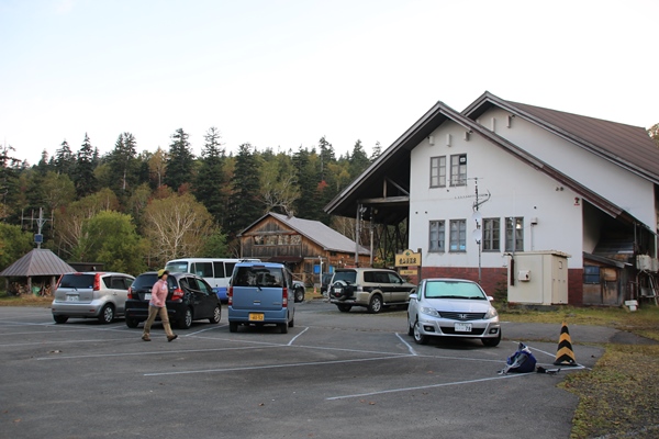 大雪山の紅葉といえば、旭岳ロープウェイ、黒岳ロープウェイ、銀泉台、高原温泉が4トップ?愛山渓温泉からのコースってのは、あまり耳にしないです。もともと入山者は少なそうですけど…。山としては当麻岳、安足間岳、永山岳のグルリ。想像するに上の方はハイマツがほとんどで、チングルマなどの草紅葉がある程度かなと。期待できそうなのは沼ノ平。草紅葉とあとは何が生えてるか…? ■愛山渓温泉へ今朝は東川町からの出発。コンビニで朝飯食ってから愛山渓温泉に向かいます。コースタイムは10時間近くあるので早く行くにこしたことはない。愛山渓温泉まで完全舗装でした。2度目ですが記憶ナシです。駐車場はガラガラでした。先客が2台くらいと、同時に着いた札幌ナンバーの人。昨日までがシルバーウィークの5連休。今日は中二日の平日です。ほとんどの人は仕事かな。