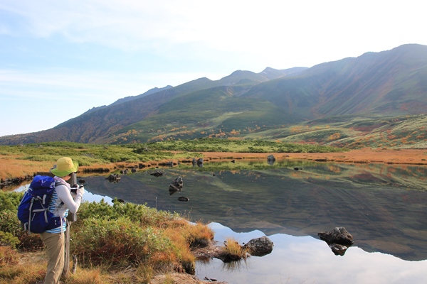 ■果たして沼ノ平の紅葉は・・・?寂しい感じの愛山渓温泉をスタート。川沿いの道を歩きます。30分くらいで渡渉した対岸が川経由と尾根経由の分岐。尾根経由に進みます。一本調子の登りから徐々に緩くなると丈の高い笹原に。もう沼ノ平かと思ってからが意外と長かった。分岐からはしばらくで沼ノ平。歩いているうちに太陽が出てくると思ってたけど、なかなか出てこない。東にある永山岳、安足間岳、当麻岳は予想以上に高い壁でした。沼ノ平に差し掛かる直前にやっと日の出です。 地形図を見てもわかる通り、沼ノ平は沼だらけ。沼を縫いながら道が付いています。縫いながらというか、避けながらが正しいかも。さてさて、期待の紅葉ですが、なんかイマイチ…。紅葉する木が少な過ぎ。ナナカマドに関してはちょっと遅いのかなと思うけど、全体的に期待外れでした…。天気も思ったより晴れてないし…。