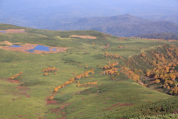 ■沼ノ平から当麻岳の尾根に取り付きます沼を離れて、当麻岳から派生する小尾根に取り付きます。少し登ると沼ノ平が見下ろせます。沼は近くを歩くより、見下ろす方が良かった感じです。だったら逆回りの方が良かったのかなあ…とか思ったり。いちいち振り返らなくてもいいので。この登り、全体的にヌカルミがひどいです。登りでも大変なので、下りはもっと大変そう。 1691mの岩峰でひと休み。ここから南側にも沼が点在しています。大雪山の西面は沼だらけですな。当麻乗越の手前から本格的な登り。途中、1900mの平坦地にはシマリスがたくさんいました。だいぶ写真撮ってしまった。南の旭岳方面の展望も広がります。ロープウェイも見えてるけど、だいぶシラ〜ッとしてしまってます。パッとしない天気だなあ…。