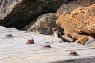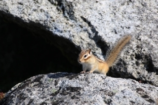 ■安足間岳は風が強いのでさっさと降ります休んでいられないので進みます。比布岳〜永山岳の稜線に乗ると、少し納まりました。崩落の進んだ愛別岳の景観が異様です。永山岳方面に少し下った風のないとこで休憩します。さらに下った永山岳の方が休憩適地でした。ベンチあり。ベンチのとこにオコジョあり。なんとか写真には納まったけど、オコジョはせわしなくてすばしっこいわ。 安足間岳の西面は滑ったら気持ちよさそうな斜面の宝庫です。とくに永山岳と当麻岳の間に広がる浅い谷、ここはテレマークで流したら気持ちいいだろうなあ。谷が落ち込む手前で登山道に上がると、さらにそこから一枚バーンが。GWには愛山渓温泉まで入れるみたいなので、いつかのGWに計画してみたいな。