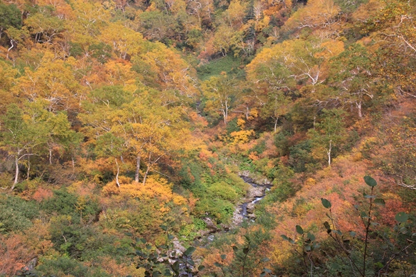 ■ひたすらの下山ひたすらの下りです。沼ノ平の沼たちが、だんだんと大きくなってきました。空はすっかり曇ってしまいました。逆回りの方が沼を見下ろす感じがいいけど、曇ってしまっては台無しです。結果的には先に沼を回って正解でした。ヌカルミを警戒していましたが、なかなか出てきません。一部分だけ逃げ場のない泥道があって苦労。でも、ひどいのはそこだけで、ヌカルミ区間も当麻岳側よりも随分と少なかったような気がします。最後は川沿いの道。かなり紅葉してたけど、日が当たらないので鮮やかではありません。下山モードにつき、川沿いが長く感じました。