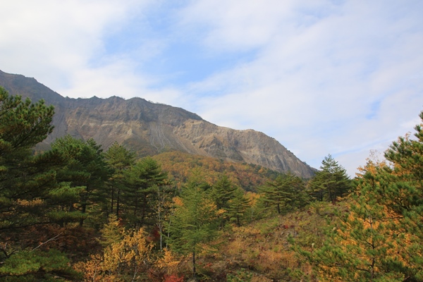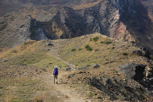 ■火口原は変わったロケーションでしたゲレンデから森に入ります。噴火からそんなに時間が経ってないためか、独特な雰囲気の森となってます。森を抜けると火口原。疎らに生えた木の向こうに火口壁が。荒々しいですね〜。火口壁というか、噴火によって山体崩壊を起こしたらしいです。それが1888年のことで、この山体崩壊でせき止められ、今の裏磐梯ができたとか。 火口まではユルユルと歩きますが、火口壁に取り付くと同時に激登り!生えてる木はモサモサしてるし、展望ないしで、黙々と登るしかありません。だいぶ登ると木が低く、薄くなってきます。振り返ると火口原とその中に銅沼。それらを取り囲む崖が迫力満点!登山道は点線になってるけど、点線にする意味がわからないくらい普通の道でした。