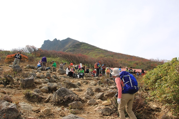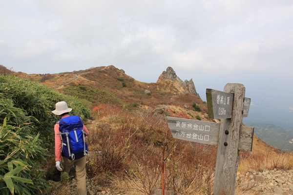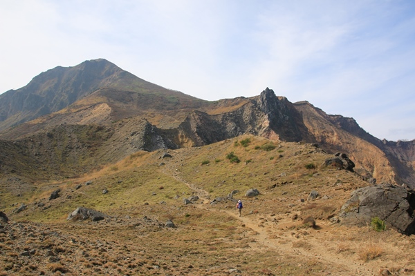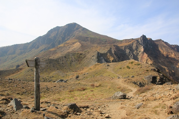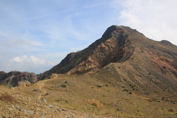 ■櫛ヶ峰とのコルに登り上げると、荒涼とした景色が・・・300mの一気登りで登り上げたところが、櫛ヶ峰とのコルにあたる1457m。景色が一変!磐梯山の山頂が見えてきました。火山の山らしく、荒涼としています。櫛ヶ峰への尾根にも踏み跡があります。岩に大きく×印があるけど、明瞭な踏み跡があるので登る人は多いんでしょうね。素晴らしい展望なんですけど、残念なのはお天気…。山頂の雲が取れたのはありがたいけど、空が青くない…。 ひと登りで沼ノ平からの道と合流。少し人が増えました。沼ノ平もよさそうなところです。気が向けば往復してこようと考えてましたが、気が向かないのでパス。この高さの紅葉はほぼ終わってるし、なにしろ天気がパッとしないので…。沼ノ平はまたの機会に。振り返るとコル越しに端正な櫛ヶ峰。磐梯山の山頂よりもカッコイイです!