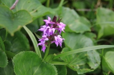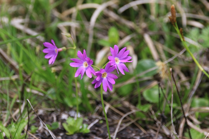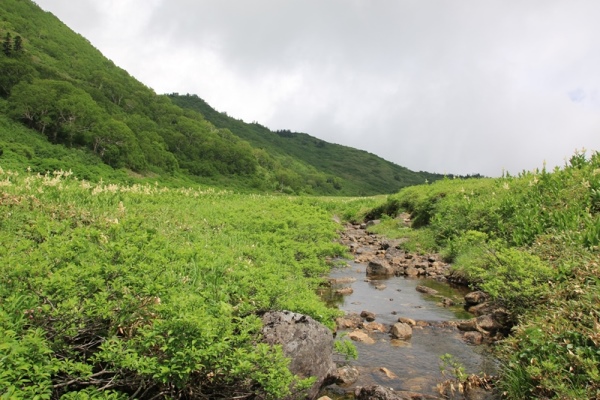 高谷池は雪融け直後で、ハクサンコザクラはこれからが見頃の雰囲気。天狗の庭との間にある小高い部分には残雪あり。早く融けたとこから花が咲いてきています。イワイチョウとコバイケイソウが目立っていますね。コバイケイソウは一昨年大盛況で昨年は全く咲かず…で、今年はまずまずの盛況ぶりのようです。