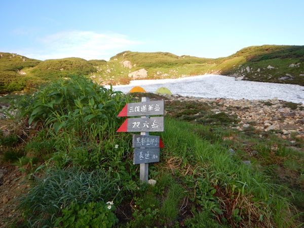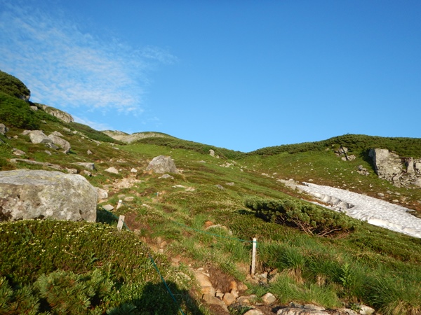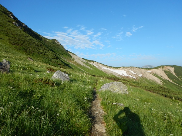 今日は水曜日。土曜日から始まった9日間の山旅も中日を迎えました。そして、三俣で3連泊していたので、実質今日から縦走開始ってところです。今日は三俣から薬師峠まで。この区間コースタイムは長いけど、多分早く着いてしまうでしょう。今日も朝から雲一つない快晴です。午後からはまた雲が出てくるんだろうなあ…。本日のメインイベントは黒部五郎岳のカールなので、そこまでは晴れていて欲しいなあ… ■三俣山荘から巻き道を利用して黒部五郎へここ2日はテント張りっぱなしの軽装だったけど、今日からは所帯道具すべて背負うことに。でも、重くは感じないなあ…。もともと少なかったし、4日分の荷物は減っているので。キャンプ場の上部から三俣蓮華岳を巻く道に入ります。今回の山歩きのテーマに、歩いたことない登山道を歩く…がありますが、この巻き道も初めてとなります。 双六からの巻き道と同様、この巻き道もカールの中を通るのでロケーションがとても良いです。三俣蓮華岳は山自体は特徴ないけど、カールが素晴らしいです。山頂から270度がカールで構成されてる感じ。カールになってないのは南西面の双六谷の源頭だけのような。カールの規模自体は大きくはないけど、お花畑と残雪と削られた岩がマッチしてます。縦走路と合流したら、あとはダラダラ下って黒部五郎小舎。