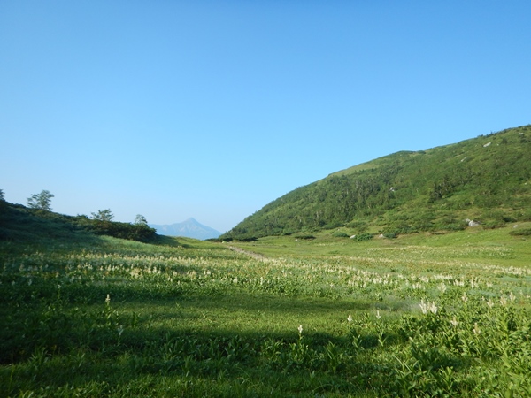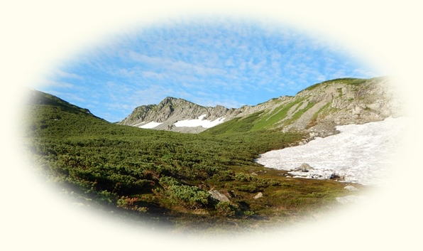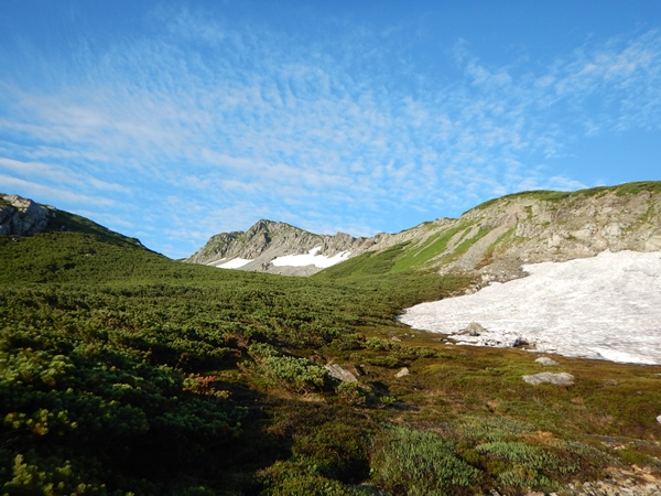■黒部五郎小舎からカール経由でさてさて、黒部五郎小舎から黒部五郎岳に登るには、カール経由と稜線経由があります。カールのコースは何度も歩いているけど、稜線コースってのは実は歩いてないのであります。今回は稜線も考えたけど、やっぱりカールを歩きたい気持ちが勝ってしまいました。稜線はスキーで一度滑っているので、通ってないことはない…ということで。 カールに入るまでは斜面を横切るように進みます。この間もずっとお花畑が連続して気持ちよく歩けます。今日も晴れてるには晴れてるけど、なんだか空が青くないです…。霞というか、薄〜い雲のような…。近くの景色には影響ないけど、遠くの山は霞んでしまってますね。どんどん黒部五郎岳のパックリ大きく開いたカールが迫ってきます。