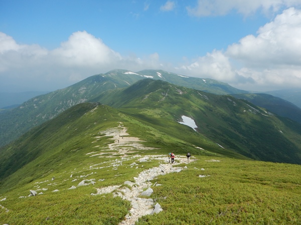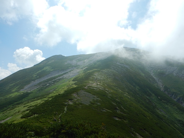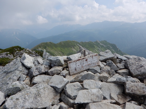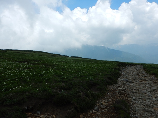 ■黒部五郎岳から北ノ俣岳は半分ガスの中一昨年歩いた時は、このカールの斜面はコバイケイソウがアホほど咲いてて、斜面全体がクリーム色になるほどでした。昨年は咲かないハズレ年。今年は咲いてるけど、一昨年ほどではないですね。もしかしたら、これからドンドン咲いてくるのかも。山頂の肩にはデポしたザックが散乱。ワタクシはポリシーというわけではないけど、ザックはデポせず山頂まで背負うことが多いです。空身が楽なのは当然だけど、まあザックも山頂に連れて行ってやる…ってことで。 黒部五郎岳は久しぶりに携帯通じたので、中休止となりました。カールの中では晴れてたけど、山頂に登る間に随分と雲が増えました。まだ10時前なのに。もう眺めはパッとしないです…。これから歩く北ノ俣岳の稜線も雲がかかり始めました。カールまでは晴れて欲しいという願い通りの展開かな。北ノ俣岳の前後は一昨年に何度も歩いたので、雲がかかってしまってもショックは小さいです。逆に涼しくて助かるくらいだわ。