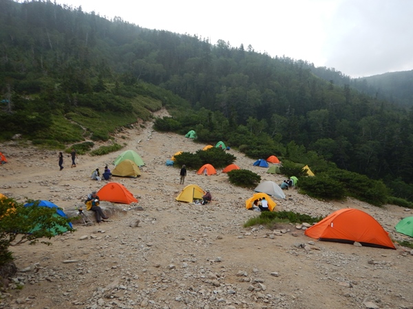 人の流れ的にテン場は混んでなさそうだったけど、やっぱり空いていました。たくさん空いていると逆に悩んでしまいますね。大岩の脇に張りました。脇に岩とかあると、座ったり、物干したりと便利です。ヒマなんですけど、大岩に座って、ビール飲んで、高校野球聞いて…。下界ではないシチュエーションです。ビールも野球も下界の物だけど、今いるところが山って言うだけの話ですね。今日は曇るのが早かったけど、雨は降ってこなかったなあ。そのぶん夕方になっても晴れなかったけど…。