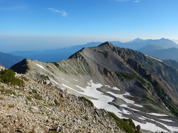 ■結構久しぶりの薬師岳山頂!薬師岳山頂は人が少なくて拍子抜け。朝ごはんとかのタイミングなのかな。昨日、三俣から薬師峠まで歩いて、山の景色がガラリと変わりました。もう北アルプス北部という雰囲気です。槍ヶ岳が随分と遠くなり、立山はもう射程距離内って感じです。今朝の空には秋を思わせるような雲が出ています。でも、今日も午後には雲が湧いてくるんだろうな。 薬師岳は太郎平から往復する人がほとんどでしょうね。薬師岳から北の稜線を歩く人は少ないはず。見えてる範囲では誰もいません。薬師岳が今日の最高地点ですが、下り始めるのは北薬師岳を越えてから。北薬師岳までは稜線歩きです。休まず薬師岳に登ったためか、北薬師へのアップダウンがやけにしんどかったような…。
