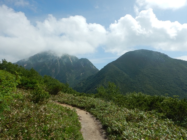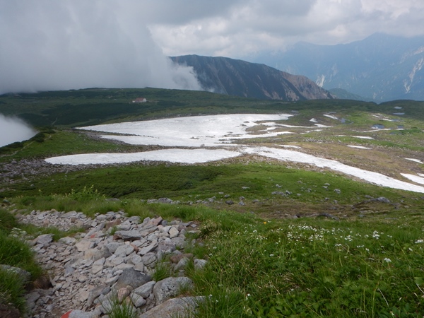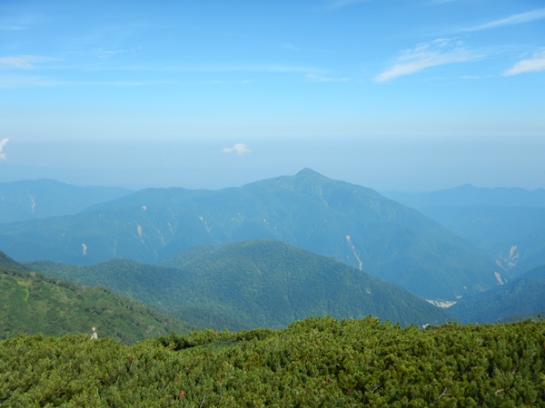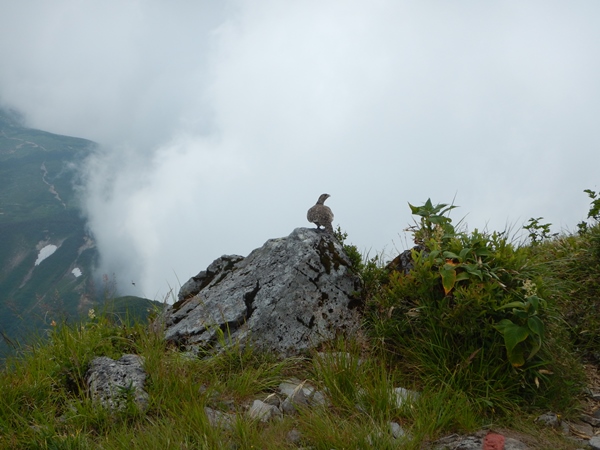 スゴの頭から越中沢岳へは、約100m下って、約300m登ることになります。100mの下りがまた急で、それを下った脚で登るんだからキツイです。間に小さなポコが一つあるのもショックだし。コルには良いテン場があったような。疲れて動けなくなっても。水さえ持ってれば快適に泊まれそうです。良いのか悪いのか、越中沢岳の登りはほとんど雲の中で、暑さという敵からは解放されました。 急坂を登り切り、あとは緩く進むと越中沢岳の山頂。山頂には若い人が1名。どうも荷物を落としたそうな…。五色ヶ原から越中沢岳まで一気に来て、どこで落としたのかわからないとか。どうしようか…色々悩んでたけど、少し戻ってみることに。すると、この時間に対向者があり、落し物は10分ほど先とのこと。近いところで落としてて不幸中の幸いでしたね。無事、予定通りに進めたようでした。