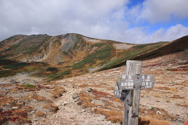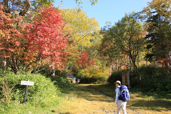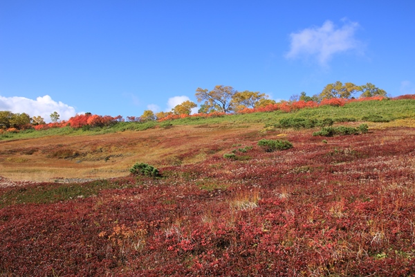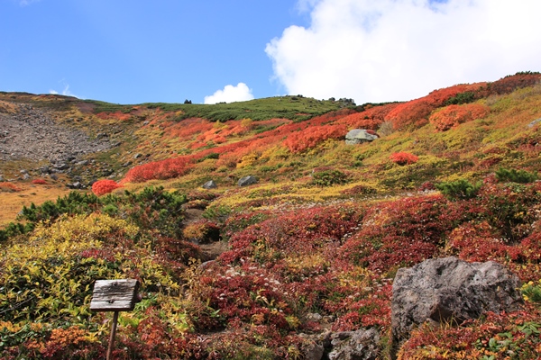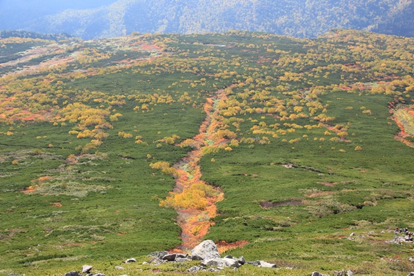 ■高原温泉から第一花畑までは我慢の区間高原温泉あたりで既に紅葉は見頃を迎えている模様。快晴のもと紅葉がキレイです。高原温泉からのお客さんの比は、沼巡り:緑岳=10:1くらい?そんなに差はないか…。高原温泉からしばらく樹林帯の急坂。ここはガマンの区間。しばらくのガマンで高根ヶ原と直下の崖が見えてきます。さらにガマンしていると台地状になり、第一花畑と呼ばれるお花畑エリアに入ります。