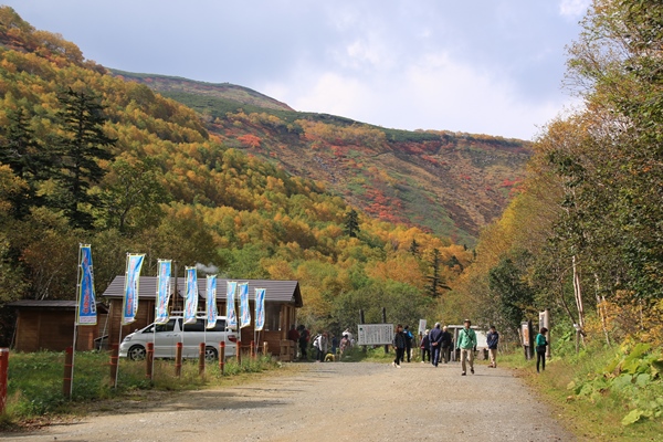 北海道上陸2日目。きのうは不安定な天気で、降ったり晴れたりの繰り返し。弱い冬型の時雨っぽい感じでした。今日も寒気が残るとかなんとか…。晴れれば高原温泉から銀泉台へ通り抜け。良くなければ西クマネシリへ。朝起きた時の天気で決めようということに。前夜はシャトルバス発着所にほど近い、大雪除雪ステーションで車中泊です。 ■紅葉時期の銀泉台と高原温泉はマイカー規制でシャトルバスそして起きたら一面の星空!空気もピリッとしてて、車の温度計では3度。ここから大雪山の稜線は見えないけど、見えてる範囲に雲はありません。こりゃあ高原温泉→銀泉台ってもんでしょ!ということで、レイクサイトへと向かいます。既にたくさんの車が来てますが、ここはキャパが大きいので、止められないという事態にはならなさそうです。 高原温泉、銀泉台とも秋の紅葉の時期以外はマイカー乗り入れ可。紅葉の時期のみマイカー規制となり、シャトルバスを利用することになります。バスに乗り換えるのは普通は面倒くさいとこですが、通り抜けできるというメリットも。今回はそのメリットを生かし、高原温泉から登って銀泉台に降りてきました。 バス乗り場のお客さんの比は、銀泉台:高原温泉=3:1くらいかな。銀泉台の始発は6時。高原温泉は6時半。銀泉台はお客さんは多いけど、バスの便も多いです。高原温泉行のバスも満員になったので、始発前に出発。しかし2台目が来ない…。結局は2便目の定刻であります7時近くになってやっと出発となりました。ウチらは1便目には乗れなかったけど、2便目のほぼ先頭だったので、座席に座れて楽チンでした。