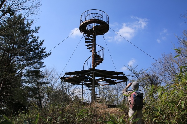 昔高森にある展望台。らせん階段を登って行くんですが、かなり老朽化していて怖いです…。登っていくとユラユラ揺れて、いつ倒壊してもおかしくないんじゃないかと思えるほどです。天気は一応晴れてるけど、どうも空気が澄んでなくて…。近くの山さえもハッキリ見えません。澄んでれば南アルプス南部の山々が見えるとのことですが、話にならない視界でした。