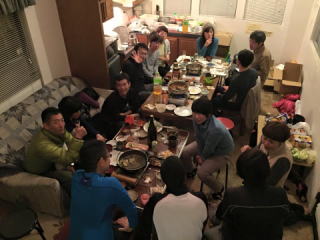 湯滝温泉にハマって、飯山のベイシアで宴会物資調達です。ここでワカン組と合流。ワカン組は斑尾山。今日の天気だと斑尾もきっと素晴らしかったことでしょう。そして宴会場へ!今年も黒姫にあるシャーウッドです。定員10名のところ16名。仕事を終えて駆け付けた2人も合流。芋洗い宴会になるかと心配してたけど、まだ余裕ある感じでした。山ヤ基準でですが…。宴会開始は5時過ぎ?で、だんだんと脱落者が出る中、最後まで残り(いつも)、日が変わった2時半でオシマイに。翌日は三田原山であります。