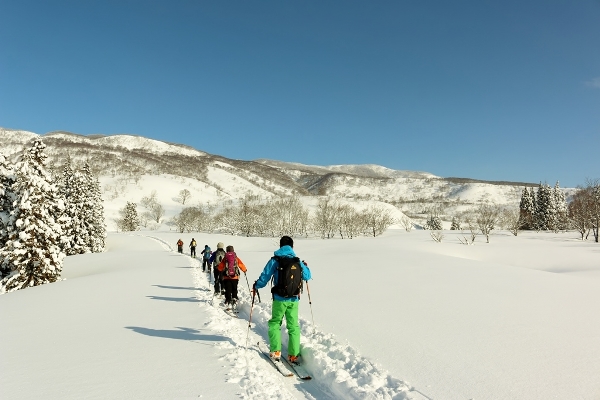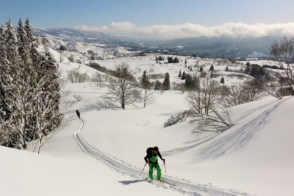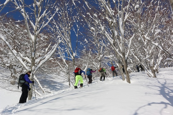 山スキーチームは9名。TOKIから4名、グリズリーから2名、マツモトから3名です。ゾロゾロと歩きます。この時間の出発なので、もちろんラッセルにはなりません。昨日のトレースも残ってるし。昨日は大雪警報が出るほど降ったんですけど、トレースの深さはスネ程度。ドカ雪が降った感じではないですね。雪質は今のところ新鮮です。上部のブナ林と北斜面は今日一杯パウダーでしょう!