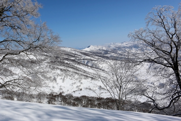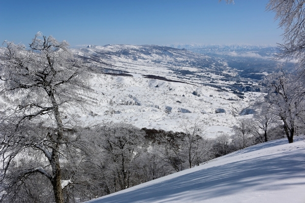出だしは曇りです。景色も気分もやや暗め。でも、だんだんと雲の隙間が増えてきてる感じです。田茂木池の雪原に出る頃にはほぼ晴れ。雪原の向こうに鍋倉山がちゃんと見えております。そして、上の方のブナには樹氷が着いているのが確認できます。鍋倉名物の樹氷ロードを歩けそうですね。日差しを浴びて、気温が上がって、登る前に落ちてしまうのだけが心配ですな。