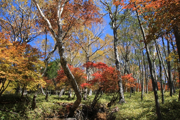 ■名残惜しいけど山頂を後にします景色を堪能したので下山です。山頂からしばらくは火山礫の斜面。中禅寺湖に向かってまっしぐらで降りていきます。樹林帯に入ってからも、朝より太陽が高くなり、林全体が明るさを増してます。とくに4合目前後の紅葉はキレイでした。登ってくる人は少なくはないけど、すれ違うのにストレスを感じない程度。客層としては登山者というよりハイカー?ファミリーや登山っぽくない若者が多かったです。