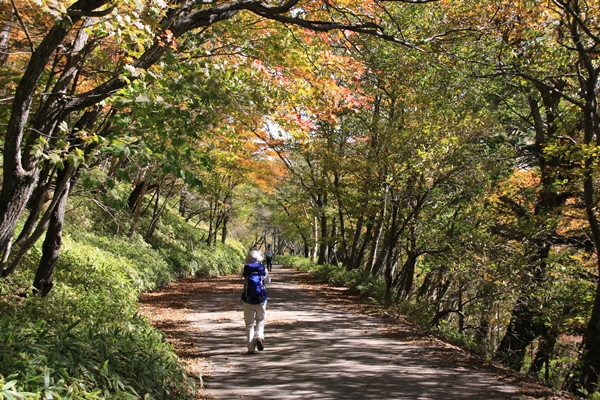 ■四合目前後は紅葉が盛りとなっておりました3合目までは展望もなく、樹林の中も暗い雰囲気。想像していた感じの雰囲気です。6時受付開始なので、登山者はこの時間に一斉スタート。前半ほど人が多いです。登山道は広かったり、踏み跡が数本あったりで、渋滞することなく流れます。時間とともに早い人、中間の人、遅い人が縦長になるんでしょうね。マラソンのように。 3合目から4合目の間は林道歩き。何故にこの間だけ林道なんでしょ?登山道が付けられないわけでもなさそうですし。まあ、黙々と登山道を歩くことを考えると、林道歩きで変化があった方が気は紛れるかもです。ただ、この林道あたりから広葉樹が増えてきて、紅葉も楽しめるように。4合目から再び山道。5合目までの間が紅葉真っ盛り。盛りではありますが、山全体が紅葉するわけではなく、時々紅葉する木が集まっている・・・程度かな。時々中禅寺湖を見下ろせたりと、なかなかのロケーション。