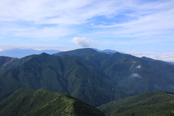 山頂は見た目通りに尖がった山頂。一番高い岩にコンクリートで固められたケルンが立ってます。展望は360度。…なんですけど、なんかワー!って感じではないです。槍・穂高連峰から白馬の山々、妙高・戸隠、浅間連山と見えてはいんるですけどね。天気のせいかなあ…?一応晴れてはいるけど、薄雲が空の半分以上を覆っています。視界は結構いいけど。