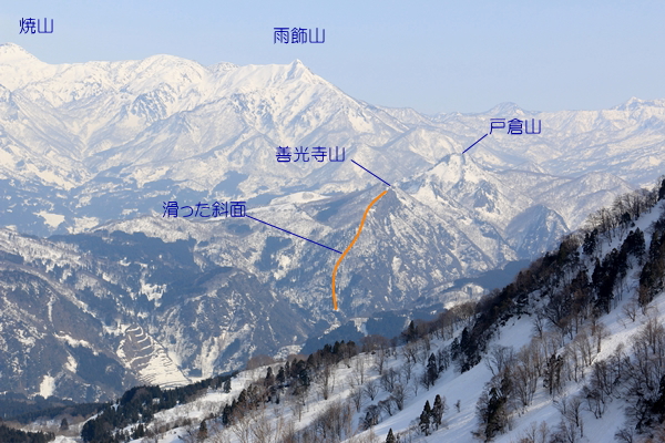 戸倉山は尖がった岩山ですが、角間峠からの南東面のみ穏やか。木が疎らで斜度も程よく、短いながらも滑りが楽しめそう。ただ、如何せん南東面。標高も低いので賞味期限は晴れれば生魚並み。かといって、晴れ以外は行く意味ないし…。南東面に入ると無風になり、汗がポタポタです。無木立の尾根に乗ると海谷三山と雨飾山。間には焼山なんかも。すごい景色です。