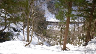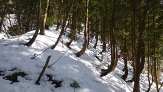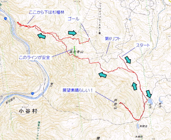 ゲレンデトップが650mなので、登り返しは約450m。はじめは滑ったラインで登ります。一番近いゲレンデは左の沢の対岸になるので、途中から左寄りに。早めに渡れれば…と思ってたけど、思ったより深くて水流出てて無理。対岸がゲレンデになるとこまで登るも、対岸の壁が急で…。無難に左岸を登るんですが、善光寺山からいくつも沢(溝)が入ってて、すんなり進めずに疲れちゃいました…。スキー場の対岸で無理やり渡っておけばよかった…。最後はゲレンデ滑り。緩くて広くて長いスキー場でした。 善光寺山北西斜面を探ってみての結論…。滑るのは400mくらいまでかな。急斜面の杉林になる前にやめる。登り返しは最後に手間を食うのを計算に入れておくか、または強引に対岸のゲレンデに渡る。ただ、新雪のシーズンだと沢を渡るのにもっと苦労するだろな。滑るのは北西面だけに新雪シーズンが良さそう。豪雪地帯だけど標高低いので、普通の年なら2月ってことになるのかな…?ま、善光寺山は登頂ついでに少し滑る…くらいのイメージでしょうね。