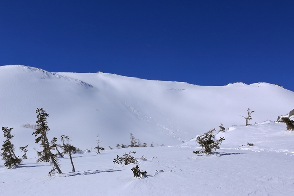 天狗原に着きます。風は思ったほど強くないです。多分弱まってきたんでしょう。ハクノリ東面大斜面を見ると、登るルートにデブリのような跡が…。風で埋まってハッキリはしませんが、多分そんな感じ。普段はあまり雪崩れない印象だけど、もしかして昨日の大雪の中誰か滑ったとか…?月〜水=概ね晴れ、木=低気圧の湿った雪、金=晴れ、土=まとまった雪。天気の移り変わりからすれば、気持ち悪さは最大級ですね〜。